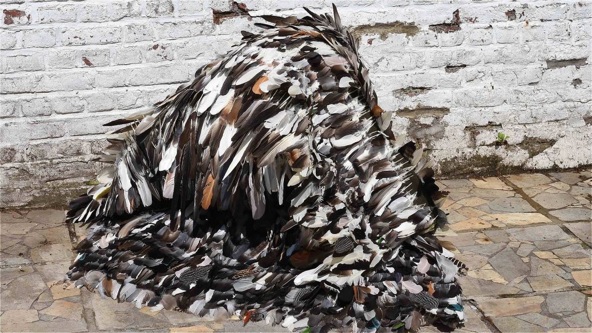 In 2015 Rebecca Lenaerts began to collect bird feathers found on the ground, walking around the streets. Collecting feathers turned into a ritual: first the washing, then the drying and treating with cedar, then the storage. In 2018, with painstaking dedication, she starts sewing the feathers one by one on a blanket creating a feather cloak. After nine months, Birdwoman was born. In mythology, she is the guardian between the human and the animal world.